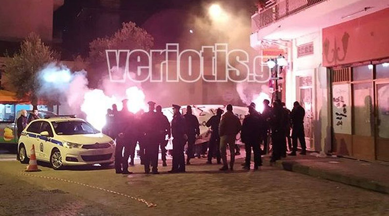 Γύρω στις 18.30 έξω από το Επιμελητήριο της πόλης συγκεντρώθηκαν οπαδοί του ΠΑΟΚ φωνάζοντας συνθήματα εναντίον της κυβέρνησης, ενώ άναψαν πυρσούς και έριξαν κροτίδες. Στην περιοχή υπήρχε ισχυρή αστυνομική παρουσία και ο Βορίδης αποχώρησε για λόγους ασφαλείας με αποτέλεσμα η σύσκεψη να διακοπεί οριστικά.