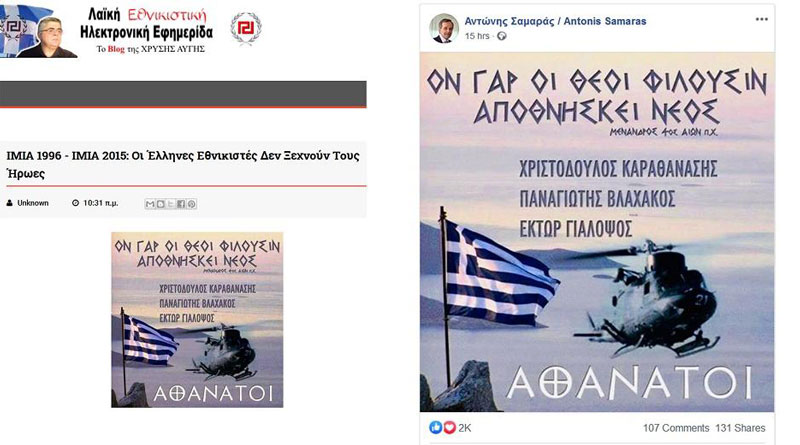 Εχει πλέον ξεφύγει ο πρώην πρωθυπουργός. Το Σάββατο το απόγευμα ο Αντώνης Σαμαράς ανάρτησε στο facebook και το twitter μια αφίσα για τους νεκρούς των Ιμίων (βλ. εικόνα από το facebook του κ. Σαμαρά). Μόνο που η αφίσα αυτή είναι χρυσαυγίτικης έμπνευσης. Τη χρησιμοποιεί εδώ και χρόνια η Χρυσή Αυγή σε όλα τα διαδικτυακά της μέσα. Ενδεικτικά δημοσιεύουμε την ίδια αφίσα από το blog της Χρυσής Αυγής τον Ιανουάριο του 2015.