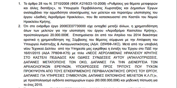 Όταν οι δημοσιογράφοι ζήτησαν τις μελέτες, οι υπουργοί αρνήθηκαν να τις δώσουν απλά επειδή δεν υπήρχε ούτε αράδα για πρόβλεψη λειτουργίας αεροδρομίου στο Καστέλι, με το κλείσιμο αυτού του Ηρακλείου! Υπήρχε μια άλλη μελέτη, την οποία οι δύο υπουργοί έκρυψαν εκείνη την “ημέρα της χαράς”. Ήταν των συνεργαζόμενων γραφείων DENCO και «ΣΣΕ Περιβάλλον», που για λογαριασμό του υπουργείου Μεταφορών ανέλαβαν να ερευνήσουν μια θέση για ένα νέο συμπληρωματικό αεροδρόμιο και όχι να εκπονήσουν μελέτη για νέο, όπως αναφερόταν στη μελέτη, 150 σελίδων, που έκαναν ότι αγνοούσαν οι υπουργ0ί.