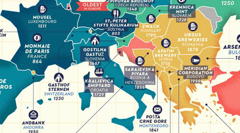 Ένα εστιατόριο στην Αυστρία με έτος ιδρύσεων το 803, ένα οινοποιίο στην Γερμανία (862) και δύο τράπεζες σε Γαλλία (864) και Βρετανία (886) είναι οι επιχειρήσεις που ξεπερνούν σε ιστορία την μία χιλιετία στην Ευρώπη και οι αρχαιότερες στην περιοχή. Οι παραπάνω κλάδοι όπως φαίνεται και στον σχετικό χάρτη είναι αυτοί οι οποίοι και την μεγαλύτερη διαχρονικότητα στην Γηραιά ήπειρο. Υπενθυμίζεται ότι η αρχαιότερη αλυσίδα στον κόσμο είναι η WHSmith με ιστορία 227 χρόνων και παρουσία και στην χώρα μας.