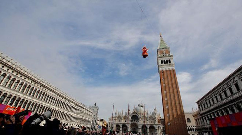 Χιλιάδες άνθρωποι, οι περισσότεροι ντυμένοι με κοστούμια εποχής, παρακολούθησαν την Κυριακή, στη διάσημη πλατεία του Αγίου Μάρκου, το παραδοσιακό «πέταγμα του Αγγέλου» στο πλαίσιο των εκδηλώσεων για το καρναβάλι της Βενετίας.