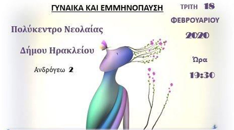 Το Τμήμα μαιών και το (πιλοτικό) διαιτολογικό γραφείο του Κ.Υ. Ηρακλείου σε συνεργασία με την 7η Υ.ΠΕ Κρήτης και το Μεσογειακό Πανεπιστήμιο Κρήτης  διοργανώνουν εκδήλωση, με θέμα: «ΓΥΝΑΙΚΑ ΚΑΙ ΕΜΜΗΝΟΠΑΥΣΗ:  Οργανικές  και ψυχοκοινωνικές επιπτώσεις  εμμηνόπαυσης. Ομαλή μετάβαση – αποτελεσματική διαχείριση».