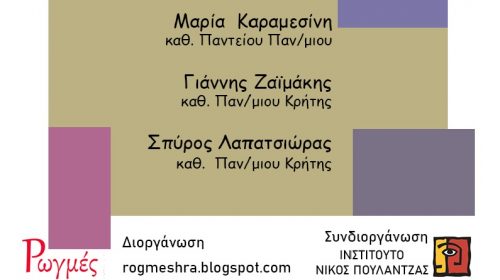 Ο χώρος ιδεών, διαλόγου και δράσης Ρωγμές σε συνεργασία με το Ινστιτούτο Νίκος Πουλαντζάς διοργανώνουν, στο Ηράκλειο, εκδήλωση / συζήτηση με θέμα: ΑΝΙΣΟΤΗΤΕΣ Απειλή για την κοινωνία και τη δημοκρατία Παρασκευή, 21 Φεβρουαρίου 2020, ώρα 7μμ Πολύκεντρο Νεολαίας Δήμου Ηρακλείου (Ανδρόγεω 4) Ομιλητές: · Μαρία Καραμεσίνη, καθηγήτρια Οικονομικών της Εργασίας και της Κοινωνικής Πολιτικής, Τμήμα Κοινωνικής Πολιτικής, Πάντειο Πανεπιστήμιο «Ανισότητες, νεοφιλελευθερισμός και νέο…