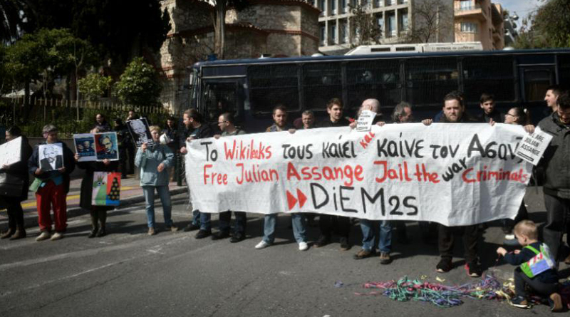 Τη συμπαράστασή τους στο Τζούλιαν Ασάνζ εξέφρασαν σήμερα το μεσημέρι διαδηλωτές έξω από την πρεσβεία της Μεγάλης Βρετανίας επί της οδού Πλουτάρχου 1 στο Κολωνάκι, ανταποκρινόμενοι στο κάλεσμα του διεθνούς κινήματος για παγκόσμια κινητοποίηση.