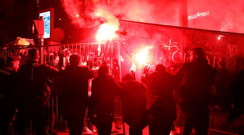 Οι διαδηλωτές κατάφεραν να ξηλώσουν τα προστατευτικά κάγκελα έξω από την αίθουσα όπου θα διεξαχθεί η τελετή απονομής των Σεζάρ, όμως δεν έφτασαν μέχρι το κόκκινο χαλί.