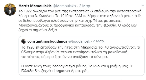 “Το 1922 άλλαξαν τον ρου της εκστρατείας & επέλεξαν την καταστροφική λύση του Β. Κων/νου. Το 1940 το ΕΑΜ πολέμησε στο αλβανικό μέτωπο & οι δεξιοί δοσίλογοι πλούτισαν στην κατοχή. Φέτος με άπατες, Μακεδονομάχους & προσφυγικό καπάρωσαν την εξουσία. Ο λαός δεν ξεχνά τι σημαίνει δεξιά”.
