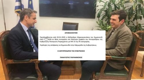 Ο Αλέξανδρος Μαρκογιαννάκης, ανιψιός του άλλοτε βουλευτή και υπουργού της ΝΔ, Χρήστου Μαρκογιαννάκη, ήταν ο υποψήφιος περιφερειάρχης Κρήτης με τη ΝΔ. Φυσικά δεν εξελέγη. Αλλά ο ίδιος δεν έμεινε… αναξιοποίητος! Το επιτελικό κράτος Μητσοτάκη, που φροντίζει καλά τα δικά του παιδιά, τον διόρισε. Τον διόρισε ως σύμβουλο στο γραφείο του αντιπροέδρου της κυβέρνησης, Παναγιώτη Πικραμμένου! Ιδού και η απόφαση (είναι…