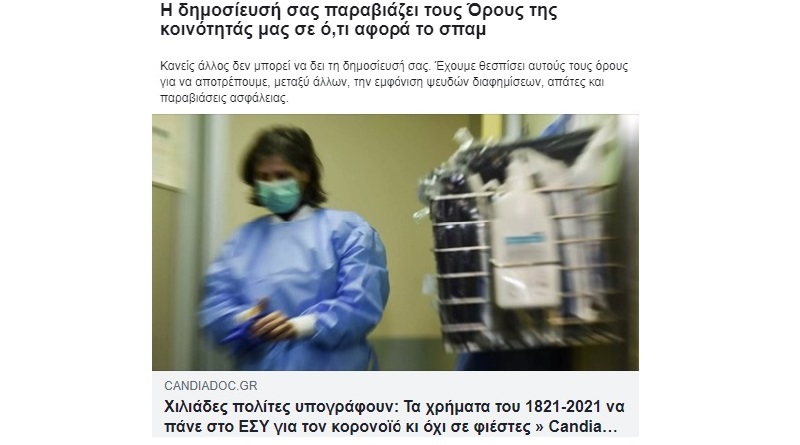 Η απίθανη ειδοποίηση, μας ήρθε από το facebook, προκαλώντας έντονα ερωτηματικά. Η ανάρτηση που κάναμε για τις διαδικτυακές υπογραφές με τις οποίες ζητείται τα χρήματα για τις φιέστες των 200 χρόνων από την Επανάσταση του 1821 (επιτροπή Γιάννας Αγγελοπούλου) να πάνε για την ενίσχυση του ΕΣΥ, παραβιάζει… τους όρους της κοινότητας ή, τέλος πάντων, δεν μπορεί να υπάρχει!
