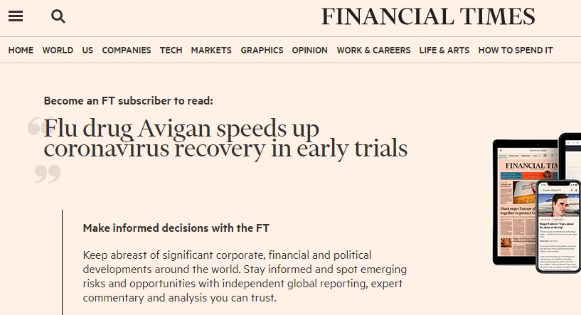 Ο εκπρόσωπος της Fujifilm έσπευσε να σημειώσει ότι η εταιρεία δεν παρείχε βοήθεια στις κλινικές μελέτες που έλαβαν χώρα στην Κίνα και πως η εταιρεία δεν έχει ολοκληρώσει την αξιολόγησή τους. Η Fujifilm παρέχει το εν λόγω φάρμακο σε νοσοκομεία της Ιαπωνίας για τη διεξαγωγή κλινικών μελετών, ενώ φέρεται να είναι έτοιμη να προχωρήσει και σε πειράματα υπό την αιγίδα της.Σε δηλώσεις, οι οποίες έγιναν πριν από τη δημοσιοποίηση των αποτελεσμάτων των κλινικών μελετών στην Κίνα, ο πρόεδρος της Fujifilm, Τζούντζι Οκάντα, είχε αναφέρει. σύμφωνα με τους Financial Times, ότι: «Θέλουμε να κάνουμε ό,τι μπορούμε, εάν φανεί ότι το Avigan μπορεί να βοηθήσει ώστε να μπει ένα τέλος στην έξαρση του κορονοϊού».