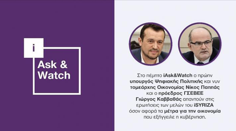 Στο πέμπτο iAsk&Watch, ο πρώην υπουργός Ψηφιακής Πολιτικής και νυν τομεάρχης Οικονομίας Νίκος Παππάς και ο πρόεδρος ΓΣΕΒΕΕ Γιώργος Καββαθάς απαντούν στις ερωτήσεις των μελών του iSYRIZA όσον αφορά τα μέτρα για την οικονομία που εξήγγειλε η κυβέρνηση.