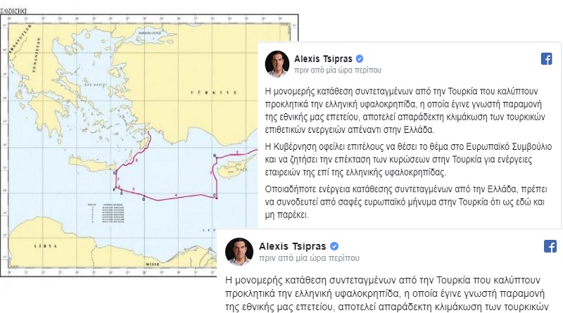 Η μονομερής κατάθεση συντεταγμένων από την Τουρκία που καλύπτουν προκλητικά την ελληνική υφαλοκρηπίδα (σ.σ.: βλέπε παρακάτω), η οποία έγινε γνωστή παραμονή της εθνικής μας επετείου, αποτελεί απαράδεκτη κλιμάκωση των τουρκικών επιθετικών ενεργειών απέναντι στην Ελλάδα.