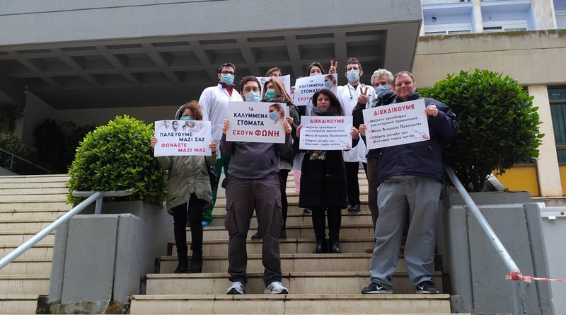 Παρόμοιες παρεμβάσεις γίνονται σε νοσοκομεία και μονάδες υγείας με κεντρικό μήνυμα: «Σπάμε τη σιωπή, δυναμώνουμε τη φωνή της διεκδίκησης για την υγεία του λαού».