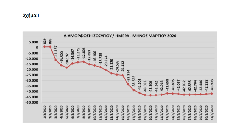 Επίσης, το ισοζύγιο του μήνα έλαβε τη δυσμενέστερη αρνητική τιμή του στις 20 Μαρτίου και, έκτοτε, παρουσίασε τάσεις βελτίωσης, γεγονός που αντανακλά την ευεργετική σταθεροποιητική επίδραση των μέτρων, που λάβαμε στην αγορά εργασίας.