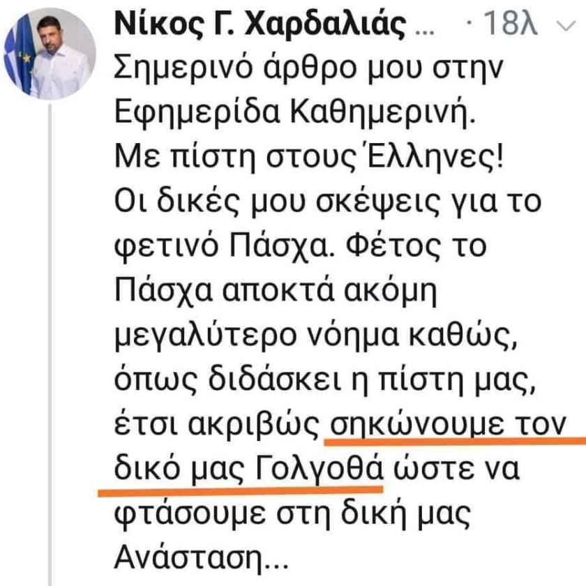 Μετά τα… τεκνά των Ελλήνων, αλλά και άλλα ανάλογα που έχει πετάξει, ο υφυπουργός Προστασίας του Πολίτη, Νίκος Χαρδαλιάς,τώρα μάθαμε ότι…σηκώνουμε και τον Γολγοθά, όπως γράφει σε άρθρο του στην “Καθημερινή”! Ναι, δε σηκώνουμε κανένα σταυρό, αλλά τον… Γολγοθά!