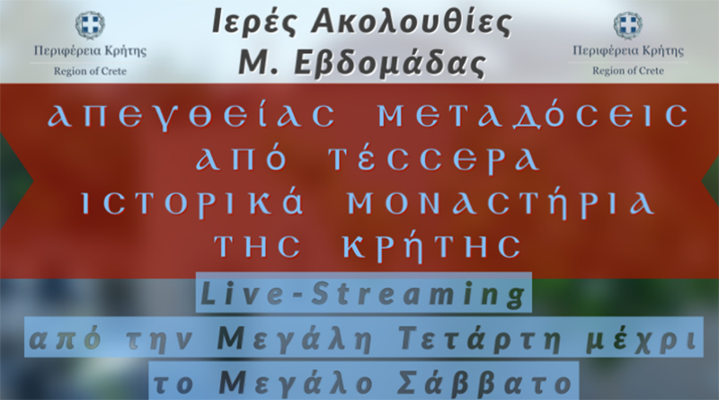 Η Περιφέρεια Κρήτης, τηρώντας τις οδηγίες του Υπουργείου Υγείας και της Γενικής Γραμματείας Πολιτικής Προστασίας σχετικά με τις Ιερές Ακολουθίες της Μεγάλης Εβδομάδας, θα μεταφέρει το κατανυκτικό πνεύμα των ημερών με απευθείας μεταδόσεις από τέσσερα ιστορικά μοναστήρια της Κρήτης.