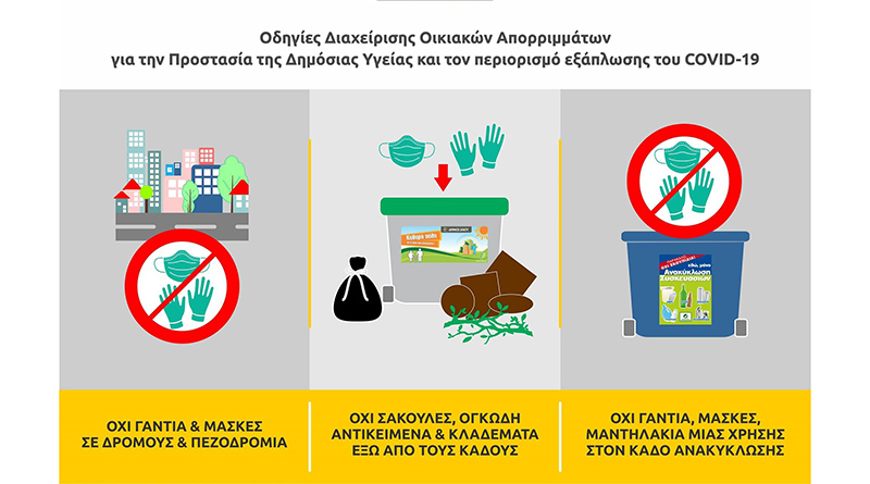 - Απορρίπτουμε όλα τα μέσα προστασίας, όπως γάντια, μάσκες, μαντηλάκια απολύμανσης και πάσης φύσεως αντισηπτικά/απολυμαντικά προϊόντα στους κάδους των σύμμεικτων απορριμμάτων (πράσινος κάδος) και σε καμία περίπτωση στους κάδους ανακύκλωσης (μπλε κάδος). Όλα τα μέσα προστασίας που χρησιμοποιούμε δεν ανακυκλώνονται και πρέπει να τοποθετούνται σε σακούλες σύμμεικτων απορριμμάτων.