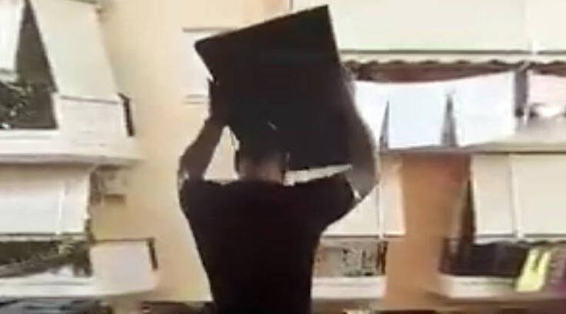 Ο νεαρός άνδρας στο βίντεο φαίνεται να έχει την τηλεόραση αγκαλιά, να βγαίνει στο μπαλκόνι και να την πετάει στον δρόμο προκαλώντας έκπληξη σε όσους τον παρακολουθούν.