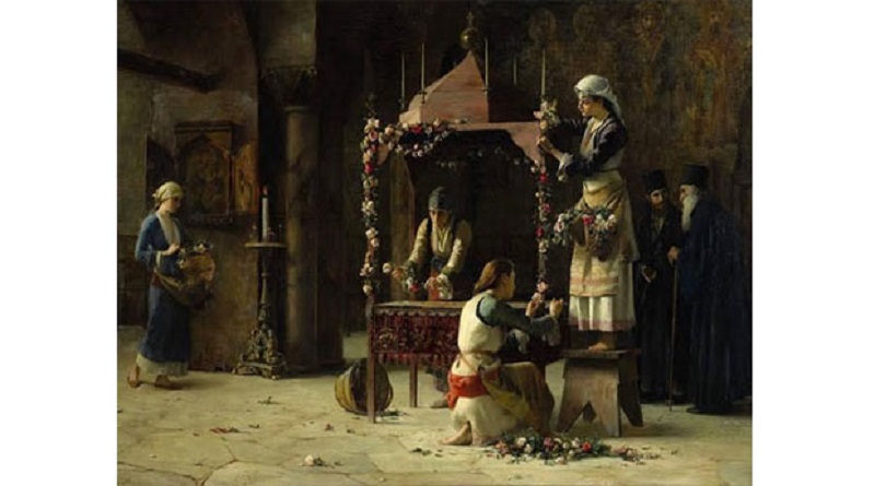 Αγοράστηκε στο Παρίσι το 1935 από τον παππού τού σημερινού ιδιοκτήτη και πέρασε, από χέρι σε χέρι, σε τρεις ολόκληρες γενιές. Ο τελευταίος του ιδιοκτήτης αποφάσισε να τον πουλήσει διά πλειοδοσίας με τιμή εκτίμησης 345.510 ως 575.827 ευρώ. Τελικά πουλήθηκε το 2010 στις 397.250 λίρες Αγγλίας. Πρόκειται για ελαιογραφία σε καμβά που χρονολογείται από την εποχή που οι ικανότητες του Ράλλη ως ζωγράφου της καθημερινής ζωής βρίσκονταν στο απόγειό τους. Απεικονίζει μια εκκλησία κατά τη διάρκεια των προετοιμασιών για το Πάσχα με τέσσερα κορίτσια να δουλεύουν μαζί για να στολίσουν έναν Επιτάφιο με λουλούδια, ενώ δύο ιερείς συζητούν. Ο ίδιος ο καλλιτέχνης θεωρούσε το έργο τόσο σημαντικό ώστε να επιλέξει να το εκθέσει στο Σαλόνι του Παρισιού το 1893, τη χρονιά που το ολοκλήρωσε.