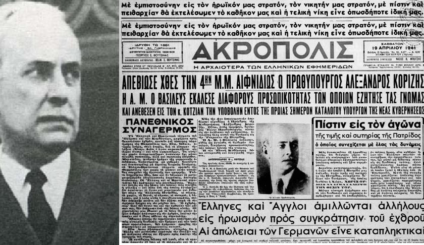 Παρασκευή, 18 Απριλίου του 1941. Ο τότε πρωθυπουργός της Ελλάδας, Αλέξανδρος Κορυζής αυτοκτονεί, προκειμένου να μη βρεθεί στη θέση να παραδώσει τη χώρα στους Γερμανούς, που βρίσκονταν κυριολεκτικά έξω από την Αθήνα και την οποία κατέλαβαν μερικές μέρες αργότερα. Προηγουμένως, στις 6 Απριλίου, ο Κορυζής είχε αρνηθεί την παράδοση της χώρας στις δυνάμεις του Χίτλερ.