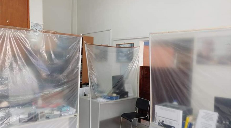 Έτσι, ελλείψει άλλων προστατευτικών μέτρων, οι εργαζόμενοι στο Υποθηκοφυλακείο Μαραθώνα – Καπανδιτρίου έφτιαξαν τα δικά τους αυτοσχέδια παραβάν για να προστατευτούν από τον κοροναϊό.