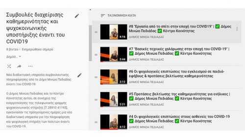 Ο Δήμος Μινώα Πεδιάδας και το Κέντρο Κοινότητας αυτού, σε συνέχεια της ενεργοποίησης της τηλεφωνικής γραμμής ψυχοκοινωνικής στήριξης [Τ.28910 41193], εγκαινίασαν τις προηγούμενες ημέρες μια νέα διαδικτυακή υπηρεσία για την πληροφόρηση και ψυχολογική στήριξη των πολιτών έναντι του COVID-19. Στο πλαίσιο αυτής, τα επιστημονικά στελέχη του Κέντρου Κοινότητας παρουσιάζουν και αναλύουν – μέσα από σύντομα βίντεο – μια σειρά από…