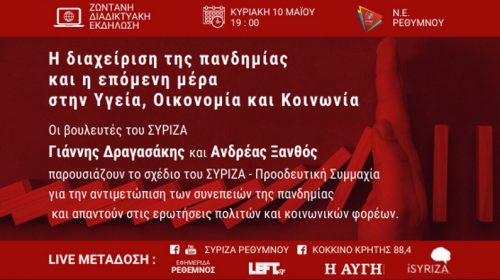 Read MoreΖωντανή διαδικτυακή εκδήλωση της ΝΕ Ρεθύμνου του ΣΥΡΙΖΑ με τον Γ. Δραγασάκη και τον Α. Ξανθό για την επόμενη μέρα στην Υγεία, Οικονομία και Κοινωνία