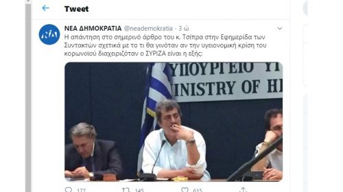 Ο Αλέξης Τσίπρας, θέτει ορισμένα πολύ σοβαρά ζητήματα για τη διαχείριση της υγειονομικής και οικονομικής κρίσης και η Νέα Δημοκρατία απαντάει με τρολ. Δείτε επίσης: Ναι, αλλά ο Πολάκης καπνίζει! – Δεν είναι πλάκα, με αυτή τη φωτο “απάντησε” η ΝΔ στο άρθρο του Α. Τσίπρα! Α. Τσίπρας: «Τι θα γινόταν αν…» ο ΣΥΡΙΖΑ ήταν εκείνος που θα αντιμετώπιζε την…