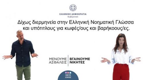 “Η εξιδανίκευση της κανονικότητας συνεχίζεται μέσα από το «Μένουμε Ασφαλείς, Βγαίνουμε Νικητές» δίχως Διερμηνεία στην Ελληνική Νοηματική Γλώσσα και υπότιτλους για κωφές/ους και βαρήκοους/ες” Η Πολιτική Προστασία απέσυρε ένα από τα σποτάκια της καμπάνιας της λόγω των αντιδράσεων που προκάλεσε το σεξιστικό περιεχόμενο του και ανέφερε στο δελτίο Τύπου: «Ο στόχος της καμπάνιας μας ήταν και είναι να ευαισθητοποιήσει το ΣΥΝΟΛΟ…