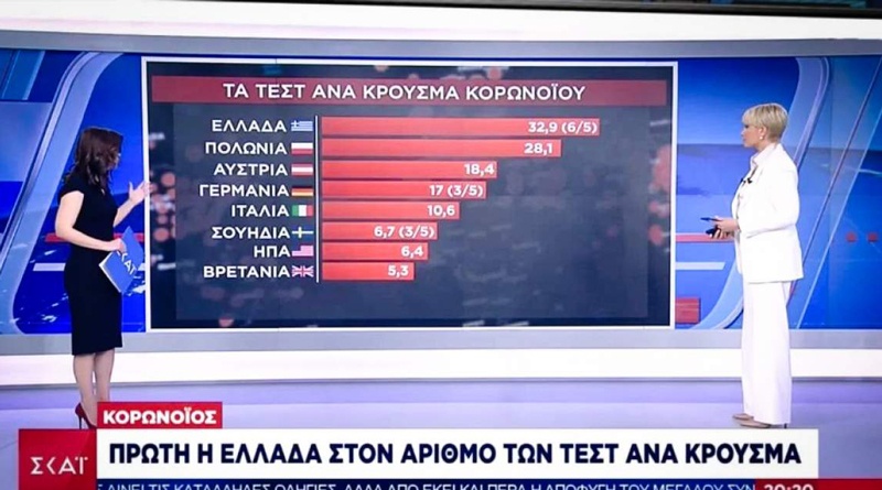 Η στατιστική κατηγορία που «ανακάλυψε» ο ΣΚΑΙ με την παντελώς άχρηστη πληροφορία των «τεστ ανά επιβεβαιωμένο κρούσμα» δείχνει ακριβώς ότι η Ελλάδα είναι η χώρα που έχει τα λιγότερα τεστ σε σχέση με τα κρούσματά της και έχει αποτύχει να ακολουθήσει την ενδεδειγμένη διεθνή πρακτική αφού στην έξαρση της επιδημίας έγιναν τεστ μόνο σε συμπτωματικούς και υπήρξε υποκαταγραφή της νόσου.