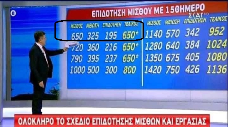 Σε όλο το κόσμο, και με βάση την κοινή λογική και την αριθμητική, από τον μισθό των 650 ευρώ, εφόσον οι περικοπές είναι 325, το αποτέλεσμα είναι 325. Προσθέτεις την “επιδότηση” των 195 και το αποτέλεσμα είναι μείωση του μισθού στα 520, από τα 650.