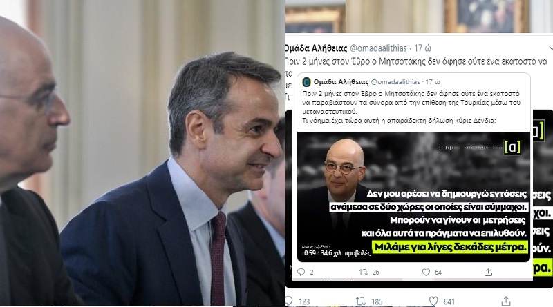 Συγκεκριμένα, η Ομάδα Αλήθειας, ένα γκρουπ στα social media το οποίο στρατηγικά προωθεί τις θέσεις της ΝΔ επιτιθέμενο παράλληλα εναντίον του ΣΥΡΙΖΑ, βάλλει με ανάρτησή του κατά του υπουργού Εξωτερικών, κάνοντας λόγο για «απαράδεκτη δήλωση εκ μέρους του» (σσ αναφερόμενη στο «μιλάμε για μερικές δεκάδες μέτρα»).