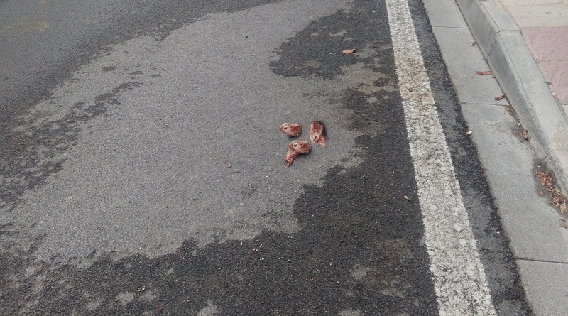 Στη γειτονιά βρίσκεται επίσης και ένα κρεοπωλείο. Από το κρεοπωλείο αυτό όλα τα υπολείμματα των σφάγιων έρχονται και αδειάζονται στον χωρίς καπάκι κάδο… Στη συνέχεια τον κάδο επισκέπτονται τα πεινασμένα σκυλιά τα οποία αφού σκίσουν τις σακούλες και αφού χορτάσουν την πείνα τους εγκαταλείπουν με τη σειρά του τα δικά τους απορρίμματα στον χώρο… Αν φυσήξει δε και κάνας νοτιάς εμείς που είμαστε ακριβώς απέναντι (και πληρώνουμε ανελλιπώς τέλη καθαριότητας) δεχόμαστε …επισκέψεις… κάθε φορά που ανοίγουμε την πόρτα μας από σερβιέτες, χαρτιά υγείας και ό,τι άλλο μπορεί να φανταστεί κανείς.