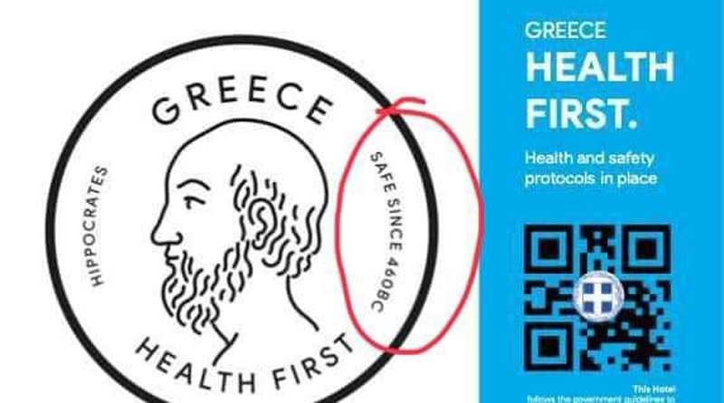 Με υπότιτλο «Ασφαλείς από το 460 π. Χ.» (γραμμένο στα αγγλικά) και σκαρίφημα του Ιπποκράτη «λανσάρεται» το σήμα πιστοποίησης (με τίτλο «Health First») τα υγειονομικά πρωτόκολλα για τον τουρισμό από το αρμόδιο υπουργείο.