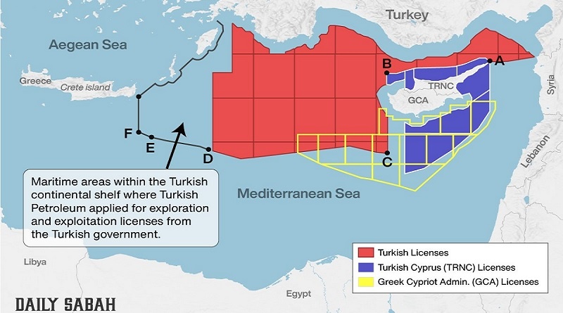 Σε χάρτη που παρουσίασε έδειξε τις επτά περιοχές για τις οποίες την προηγούμενη εβδομάδα η Εταιρεία Πετρελαίων της Τουρκίας υπέβαλε αίτηση για άδεια έρευνας και γεώτρησης.