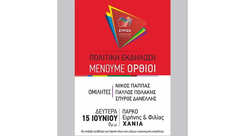 Η Ν.Ε ΣΥΡΙΖΑ Χανίων καλεί τους φίλους και τα μέλη της σε ανοιχτή Πολιτική Εκδήλωση τη Δευτέρα 15/6/2020,ώρα 20.00 στο Πάρκο Ειρήνης και Φιλίας.