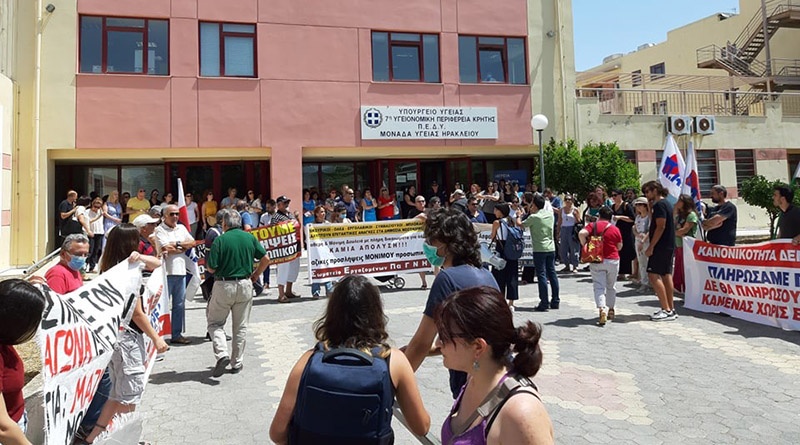 Με μεγάλη συμμετοχή πραγματοποιήθηκε σήμερα, 16 Ιουνίου, απεργιακη συγκέντρωση , ύστερα από κάλεσμα του Σωματείου Εργαζομένων ΠαΓΝΗ. Στην κινητοποίηση συμμετείχαν τα σωματεία εργαζομένων των νοσοκομείων Αγίου Νικολάου και Ιεράπετρας, ο σύλλογος εργαζομένων της 7ης ΥΠΕ, συμβασιούχοι εργαζόμενοι (επικουρικοί και μέσω ΟΑΕΔ). Πολυπληθής ήταν και η παρουσία εργαζομένων από το Βενιζέλειο Νοσοκομείο. Στην συγκέντρωση παραβρέθηκε η γραμματεία του ΠΑΜΕ ν. Ηρακλείου, το Σωματείο Συνταξιούχων ΙΚΑ Ν. Ηρακλείου, οι ομάδες γυναικών της ΟΓΕ, ο πρόεδρος του συλλόγου εργαζομένων στη ΠΦΥ, ο σύλλογος Νοσηλευτών Ν. Λασιθίου, ο σύλλογος φοιτητών Ιατρικής και το μέλος της διοίκησης της Ένωσης Γιατρών Ν. Ηρακλείου, Ράνια Μπέτση.