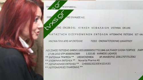Ένα από τα αποδεικτικά στοιχεία που “καίνε” την πρώην Εισαγγελέα Διαφθοράς Ελένη Ράικου για την οικονομική σχέση της Novartis, την οποία θεωρητικά ερευνούσε, με την οικογένειά της, διαβιβάστηκαν από την Εισαγγελέα Διαφθοράς Ελένη Τουλουπάκη προς την Προανακριτική Επιτροπή της Βουλής. Αυτό αποδεικνύει ότι γνώριζε για τις συναλλαγές και τις απέκρυψε. Πρόκειται – όπως αποκαλύπτει το tvxs.gr– για έμβασμα 1.000 ευρώ…