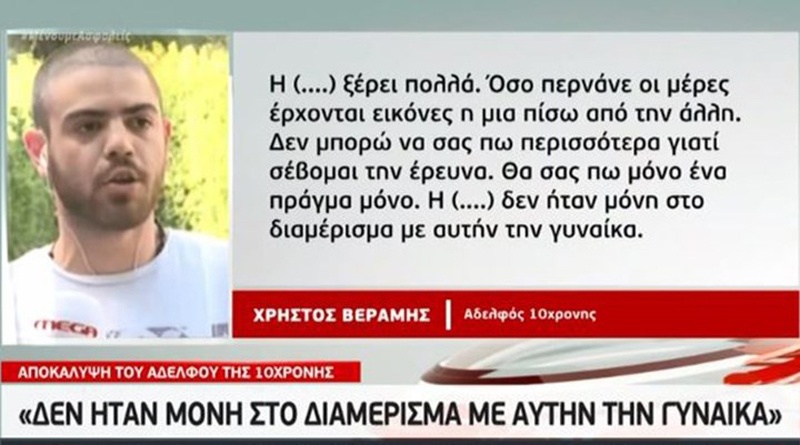 Σε μία δήλωση που θα συζητηθεί, προχώρησε την Τρίτη ο αδελφός της 10χρονης Μαρκέλλας, ο οποίος μιλώντας στο Mega αποκάλυψε πως η 33χρονη κατηγορούμενη που προφυλακίστηκε μετά την απολογία της, δεν ήταν μόνη στο διαμέρισμα. «Η Μαρκέλλα ξέρει πολλά. Όσο περνάνε οι μέρες έρχονται εικόνες η μια πίσω από την άλλη. Δεν μπορώ να σας πω περισσότερα γιατί σέβομαι την έρευνα. Θα σας πω μόνο ένα πράγμα μόνο. Η Μαρκέλλα δεν ήταν μόνη στο διαμέρισμα με αυτήν την γυναίκα», είπε χαρακτηριστικά ο αδερφός της 10χρονης.