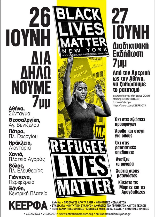 Σας καλούμε να οργανώσουμε μαζί με τους πρόσφυγες και τις κοινότητες μεταναστών ένα συλλαλητήριο ενάντια στο ρατσισμό, στις 26 Ιούνη. Να πιάσουμε το νήμα των διεθνών κινητοποιήσεων που στις 21 Μάρτη αντιμετώπισαν τις απαγορεύσεις λόγω της πανδημίας αλλά τώρα ξεχειλίζουν σε όλο το πλανήτη.