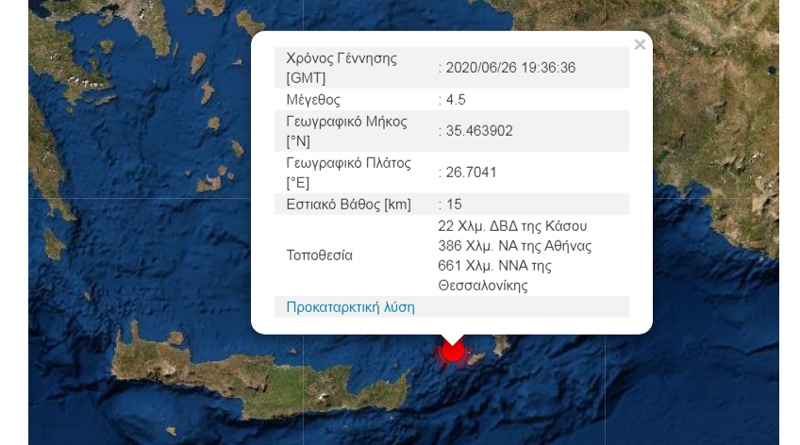 Σύμφωνα με την αυτόματη Λύση του Γεωδυναμικού Ινστιτούτου Αθηνών η ένταση του σεισμού υπολογίζεται στα 4,5 Ρίχτερ, με εστιακό βάθος τα 15 χιλιόμετρα και σημειώθηκε 22 χλμ. Δυτικά – Βορειοδυτικά της Κάσου.