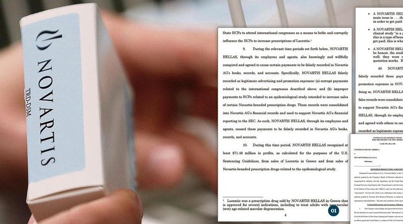 Σύµφωνα µε τα αµερικανικά έγγραφα που δηµοσιεύει το Documento, µεταξύ των ετών 2012 και 2015 η Νovartis Hellas «πλήρωνε» δηµόσιους αλλά και ιδιώτες οφθαλµίατρους προκειµένου να παρακολουθήσουν ιατρικά συνέδρια σε χώρες τις Ευρώπης αλλά και στις ΗΠΑ. Τις πληρωµές-δωροδοκίες αποδέχτηκε η ίδια η εταιρεία στον συµβιβασµό που έκανε µε την αµερικανική ∆ικαιοσύνη. Οι δωροδοκίες πραγµατοποιούνταν είτε µε τη συµµετοχή γιατρών σε διεθνή συνέδρια είτε µέσω της συµµετοχής σε επιδηµιολογική µελέτη.