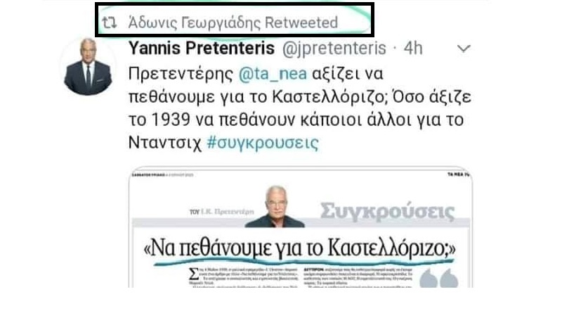 Αναρωτιέται ο Πρετεντέρης αν αξίζει να πεθάνουμε για το Καστελλόριζο. Και ο Άδωνης κοινοποιεί το ερώτημά του! Δηλαδή υπουργός της κυβέρνησης συμφωνεί ότι τίθεται ερώτημα για το αν αξίζει κανείς να πεθάνει για το έδαφος της πατρίδας του.