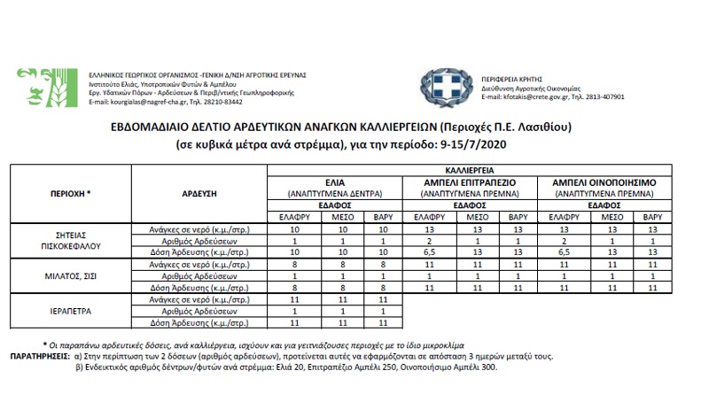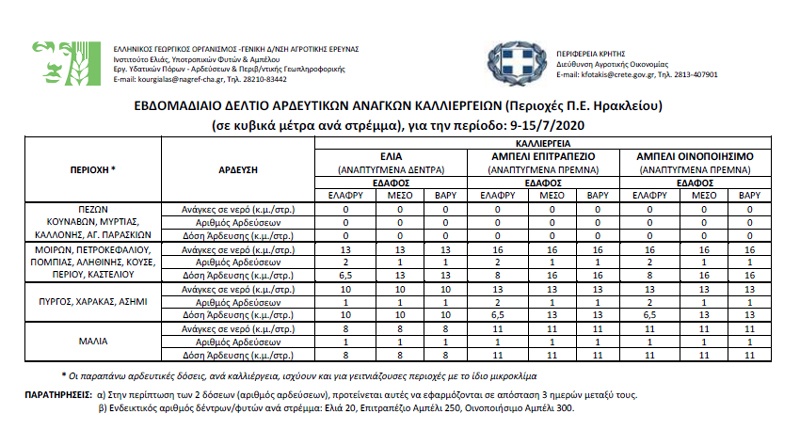 Ανακοίνωση εξέδωσε η Διεύθυνση Αγροτικής Οικονομίας της Περιφέρειας Κρήτης, μέσω της οποίας παρουσιάζει τα αρδευτικά δελτία και των τεσσάρων νομών της Κρήτης για την εβδομάδα από 09/07 έως 15/07/2020.