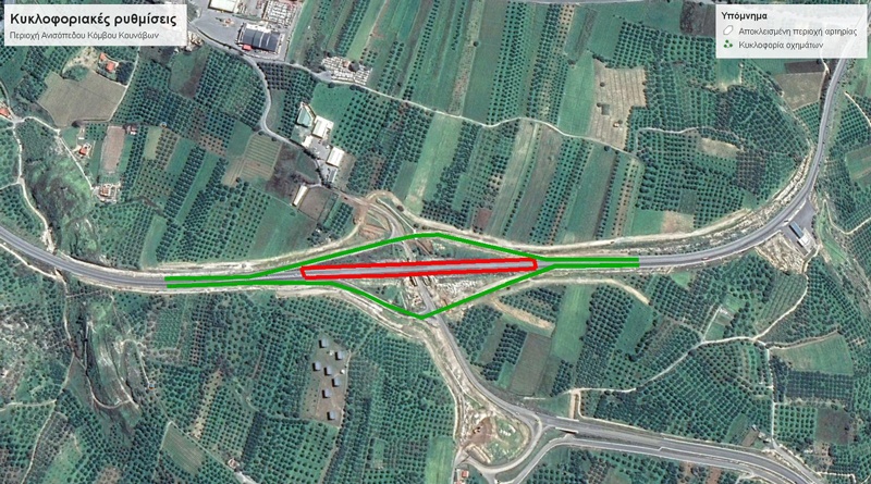 Η εκτροπή της κυκλοφορίας από την αρτηρία θα πραγματοποιείται μέσω των νέων κλάδων του ανισόπεδου κόμβου που έχουν ήδη κατασκευαστεί. Με τον τρόπο αυτό επιτυγχάνεται η συνεχής κίνηση των οχημάτων από Ηράκλειο προς Βιάννο και αντίθετα, με μία λωρίδα κυκλοφορίας ανά κατεύθυνση, χωρίς διακοπή της κυκλοφορίας και χωρίς καμία στένωση. Η κυκλοφορία επί της συνδετηρίας οδού του κόμβου που εξυπηρετεί τη σύνδεση των Κουνάβων με το Χουδέτσι θα εκτελείται χωρίς καμία διακοπή κυκλοφορίας και εκτροπή.