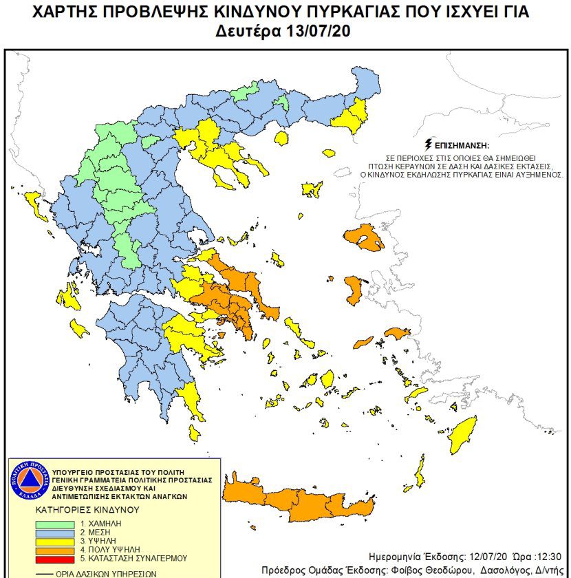 Η Πολιτική Προστασία Περιφέρειας Κρήτης ενημερώνει ότι, σύμφωνα με τον ημερήσιο Χάρτη Πρόβλεψης Κινδύνου Πυρκαγιάς της Γενικής Γραμματείας Πολιτικής Προστασίας, για αύριο Δευτέρα 13 Ιουλίου 2020 η κατηγορία κινδύνου για το ΣΎΝΟΛΟ ΤΗΣ ΚΡΗΤΗΣ είναι κατηγορίας κινδύνου 4 (πολύ υψηλός).