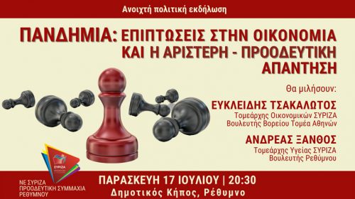 Την Παρασκευή 17 Ιουλίου Η Νομαρχιακή Επιτροπή Ρεθύμνου του ΣΥΡΙΖΑ-Προοδευτική Συμμαχία διοργανώνει την Παρασκευή 17 Ιουλίου 2020 στις 20:30 στο Δημοτικό Κήπο στο Ρέθυμνο, ανοιχτή εκδήλωση-συζήτηση με θέμα: «Πανδημία, επιπτώσεις στην οικονομία και η αριστερή-προοδευτική απάντηση». Ομιλητές: Ευκλείδης Τσαλαλώτος, Τομεάρχης Οικονομικών ΣΥΡΙΖΑ, Βουλευτής Βόρειου Τομέα Αθηνών Ανδρέας Ξανθός, Τομεάρχης Υγείας ΣΥΡΙΖΑ, Βουλευτής Ρεθύμνου