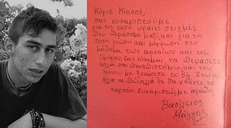 «Είχα την τιμή, πριν πολλά χρόνια, να διδάξω στο Μουσικό Σχολείο Βόλου. Υπέροχο σχολείο, υπέροχοι μαθητές. Την τελευταία μέρα – θα έφευγα με απόσπαση – με περίμενε στην έδρα ένα τεράστιο κόκκινο χαρτόνι με λίγα λόγια από τα παιδιά του Β2. Τα παιδιά μου. Βασίλη, είχες κι άλλα να πεις. Δε σου έφτανε το χαρτόνι. Ήδη όμως είπες αρκετά, παλικάρι μου. Θα σε θυμάμαι για πάντα».