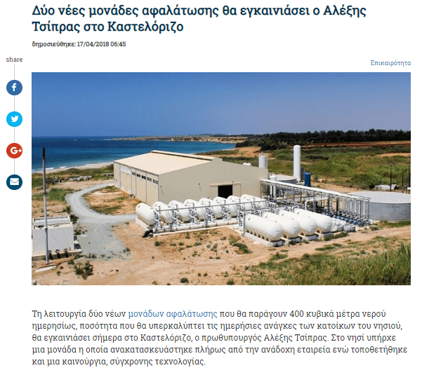 Ως έργο του υπουργείου Ναυτιλίας παρουσίασε την Πέμπτη κατά την επίσκεψή του στο Καστελόριζο ο υπουργός Ναυτιλίας Γιάννης Πλακιωτάκης τη Μονάδα Αφαλάτωσης που λειτουργεί στο νησί από το 2018 και την είχε εγκαινιάσει τον Απρίλιο του 2018 ο τότε πρωθυπουργός, Αλέξης Τσίπρας!