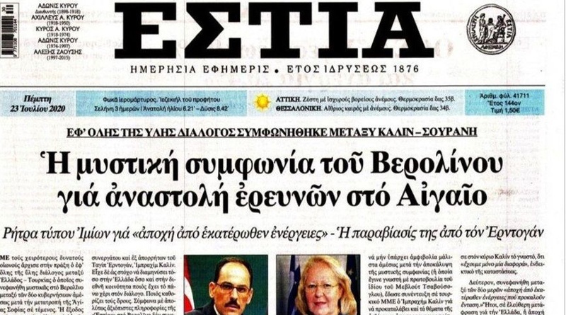Ειδικότερα, σύμφωνα με το δημοσίευμα, η πρόσφατη διήμερη κρίση στο Αιγαίο, με την έξοδο του τουρκικού στόλου, συνδέεται με τον «εφ’ όλης της ύλης διάλογο μεταξύ Ελλάδος – Τουρκίας ο οποίος συνεφωνήθη μυστικώς στο Βερολίνο μεταξύ των δύο κυβερνήσεων αμέσως μετά τη μετατροπή της Αγίας Σοφίας σε τέμενος».