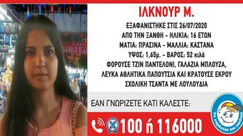 Αγνοείται εδώ και δυο μέρες Συναγερμός έχει σημάνει στην Ξάνθη για την εξαφάνιση 16χρονης. Για το κορίτσι έχει ενημερωθεί και το Χαμόγελο του Παιδιού, που εξέδωσε και σχετική ανακοίνωση. Πιο συγκεκριμένα, το Χαμόγελο του Παιδιού ενημερώνει ότι «στις 26/7/2020, στις 07:00, εξαφανίστηκε από το σπίτι της στην περιοχή της Ξάνθης, η Ιλκνούρ Μ., 16 ετών. Η Ιλκνούρ Μ.έχει ύψος 1,65 μ., 52 κιλά…